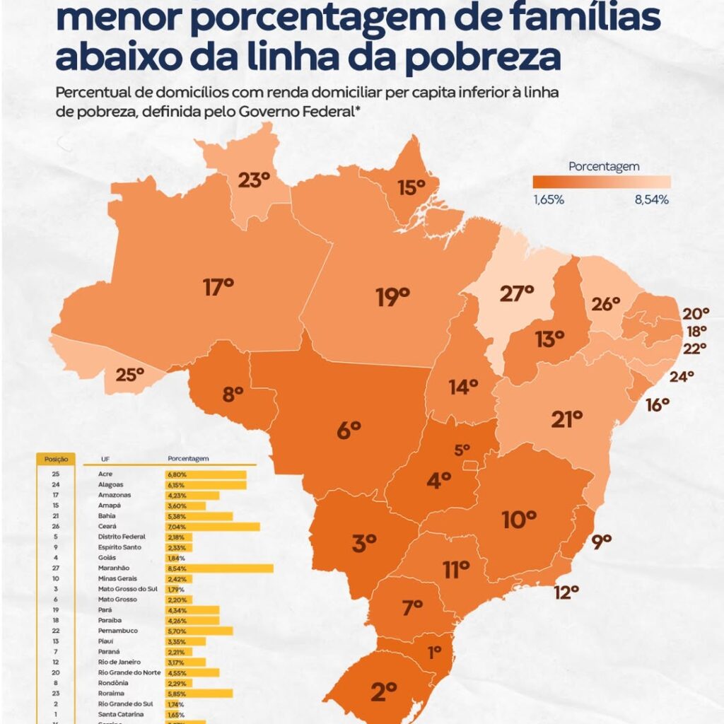 O mais recente Ranking de Competitividade dos Estados, elaborado pelo Centro de Liderança Pública (CLP) com base em dados do IBGE, publicado hoje (21), trouxe um retrato preocupante para o Acre. O estado aparece na 25ª posição entre os 27 estados brasileiros quando o assunto é o percentual de famílias vivendo abaixo da linha da pobreza. Segundo o levantamento, 6,80% dos domicílios acreanos têm renda per capita inferior ao mínimo definido pelo Governo Federal.