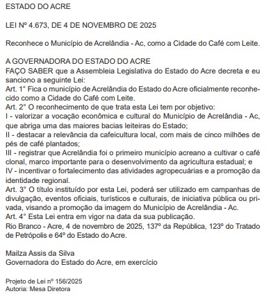 A produção rural de Acrelândia acaba de ganhar um reforço simbólico importante. A Lei nº 4.673/2025, , publicada na edição de hoje (07) do Diário Oficial do Estado, reconhece oficialmente o município como a Cidade do Café com Leite no Acre. A iniciativa tem o objetivo de valorizar a vocação agropecuária local, onde convivem duas atividades fortes: a bacia leiteira, considerada uma das maiores do Estado, e a cafeicultura, que hoje contabiliza mais de cinco milhões de pés plantados.