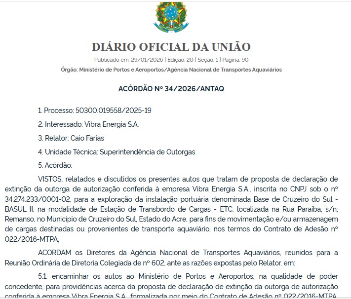 A Agência Nacional de Transportes Aquaviários (ANTAQ) deliberou pelo encaminhamento ao Ministério de Portos e Aeroportos de proposta para extinção da outorga de autorização da instalação portuária Base de Cruzeiro do Sul (BASUL II), localizada no município de Cruzeiro do Sul, no Acre. A medida consta no Acórdão nº 34/2026 e decorre de pedido formal de renúncia apresentado pela própria Vibra Energia S.A., atual autorizatária da estrutura.