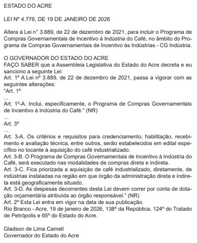 Um dia depois de o deputado estadual Edivaldo Magalhães (PCdoB) cobrar publicamente a regulamentação de uma lei voltada ao fortalecimento da cadeia do café no Acre, o governo do estado publicou, na edição desta quinta-feira (12) do Diário Oficial, a Lei nº 4.776/2026, que cria o Programa de Compras Governamentais de Incentivo à Indústria do Café. A medida altera a legislação anterior e insere oficialmente o café no Programa de Compras Governamentais de Incentivo às Indústrias (CG Indústria).