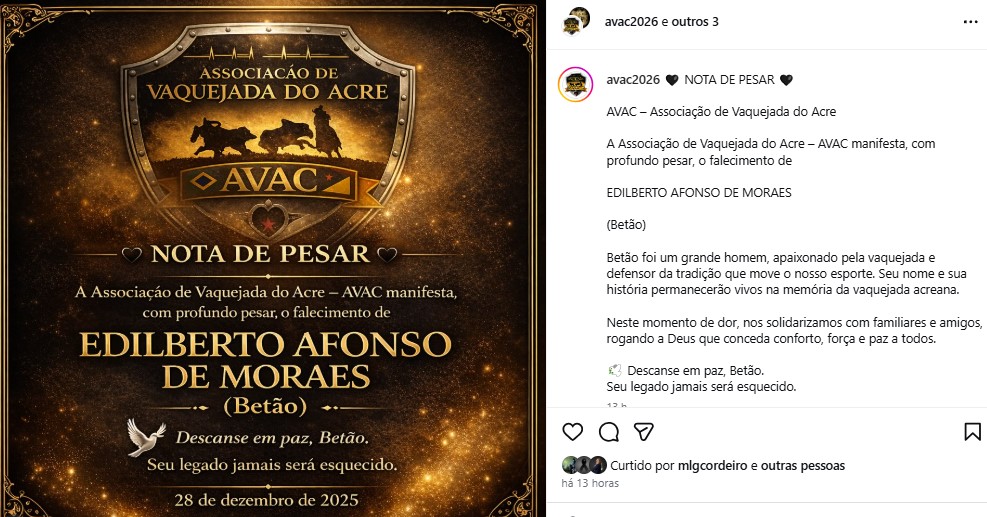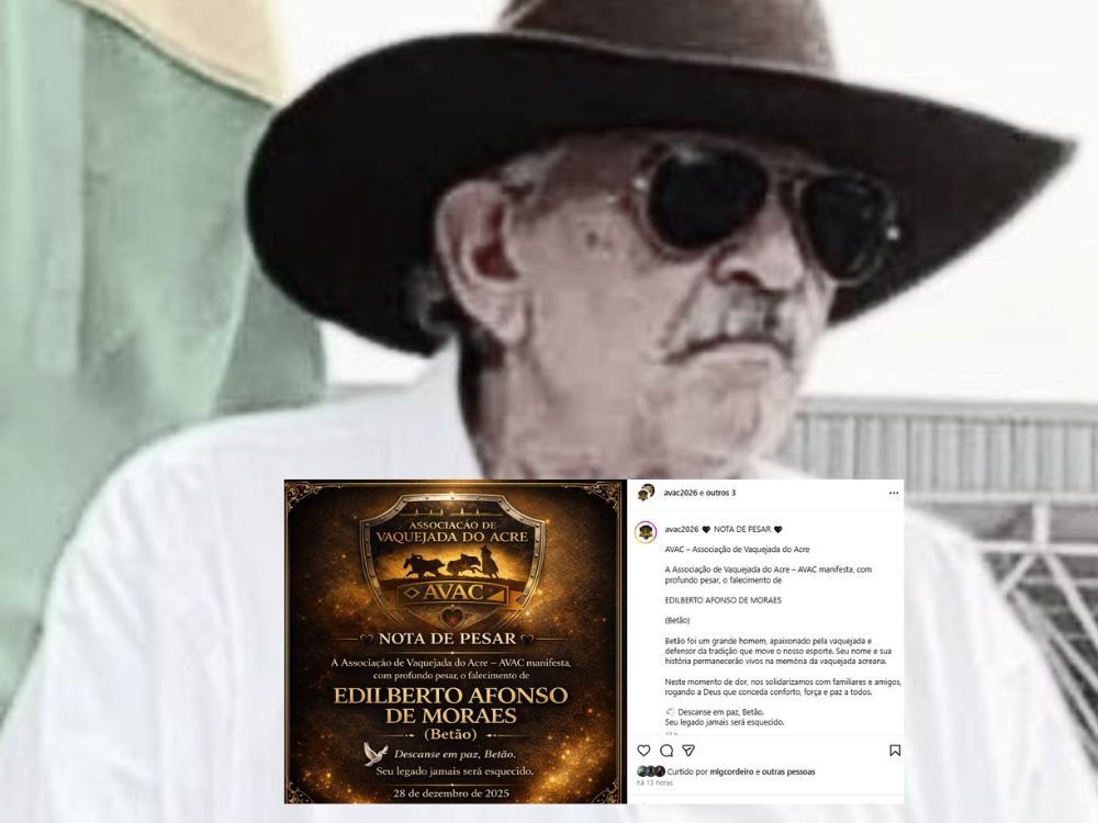 A vaquejada acreana se despede de um dos seus maiores incentivadores. A Associação de Vaquejada do Acre (AVAC) manifestou profundo pesar pela morte de Edilberto Afonso de Moraes, o Betão, que faleceu neste domingo (28) em Rio Branco. Figura conhecida e respeitada entre os vaqueiros do estado, Betão era apaixonado pelo esporte e defensor da modalidade, ele ajudou a consolidar a vaquejada como atividade cultural e de integração entre os produtores rurais.