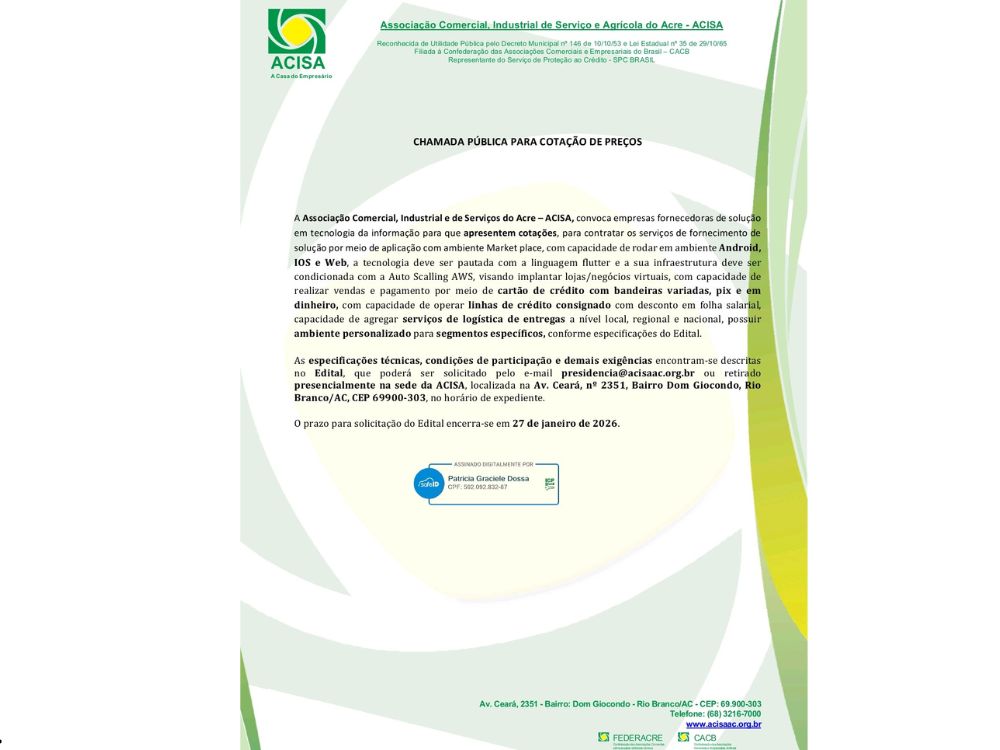 A Associação Comercial, Industrial e de Serviços do Acre – ACISA convoca empresas fornecedoras de soluções em tecnologia da informação a apresentarem cotações para a contratação de serviços de fornecimento de solução tecnológica por meio de aplicação com ambiente marketplace.