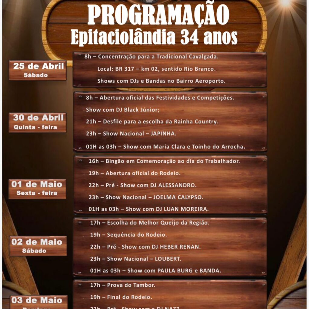 A Prefeitura de Epitaciolândia divulgou a programação oficial do Circuito Country 2026, um dos eventos mais tradicionais do calendário cultural do município, que este ano chega com novidades voltadas à valorização da cultura rural. Entre os destaques estão a inclusão do concurso de ordenha manual e a realização do II concurso do melhor queijo da região, além de uma extensa agenda de shows, rodeio e atividades culturais ao longo de vários dias.