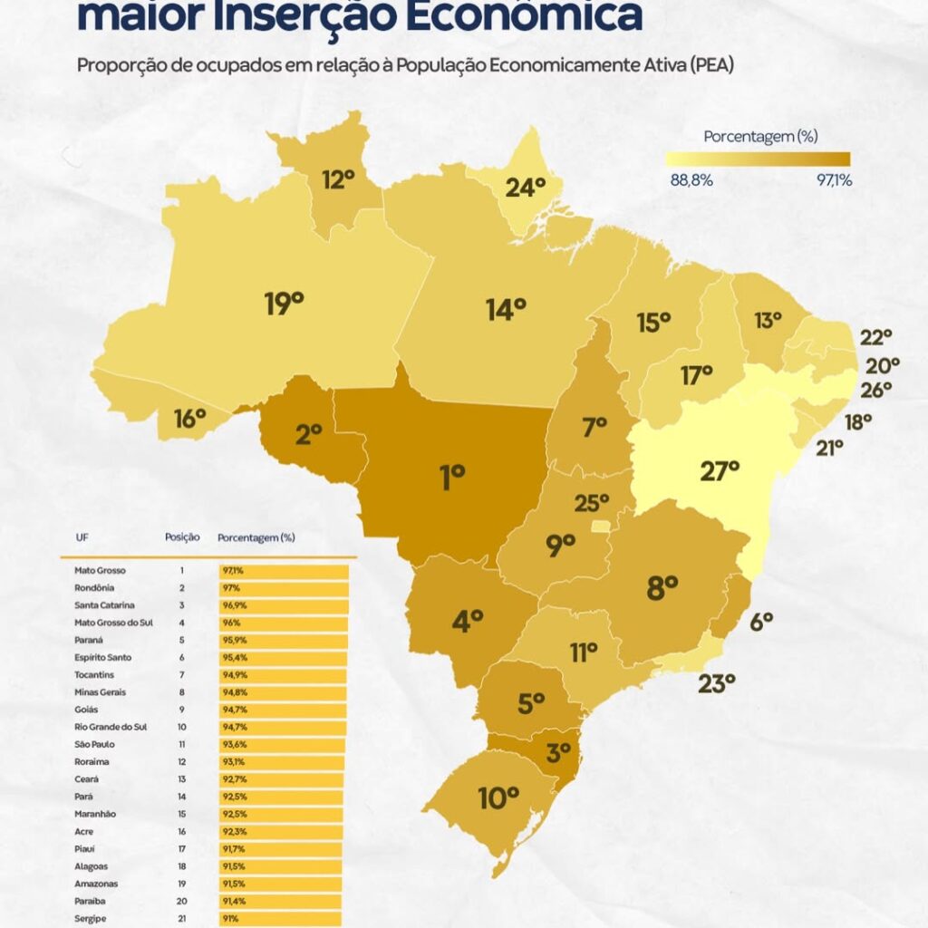 O ranking busca identificar os estados mais competitivos do país a partir de diversos indicadores, sendo a inserção econômica um dos principais termômetros da dinâmica do mercado de trabalho. Quanto maior o percentual de pessoas ocupadas dentro da PEA, melhor o desempenho do estado nesse quesito, refletindo maior capacidade de absorção de mão de obra. Os dados também evidenciam desigualdades regionais e desafios estruturais para ampliação de oportunidades de emprego formal e informal.