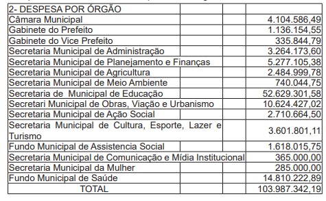 A análise do quadro orçamentário mostra que a Secretaria Municipal de Agricultura contará com R$ 2,48 milhões em 2026, valor inferior ao destinado a pastas de ‘menor impacto direto’ na geração de renda, como para as secretarias de Ação Social (R$ 2.710.664,50), Cultura, Lazer, Esporte e Turismo (R$ 3.601.801,11) e Planejamento e Finanças (R$ 5.277.105,38).