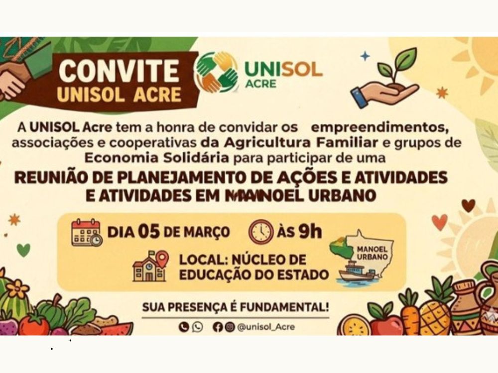 A Unisol Acre realiza nesta quarta-feira (5), às 9h, uma reunião de planejamento voltada a empreendimentos, associações e cooperativas da agricultura familiar e grupos de economia solidária em Manoel Urbano. O encontro será realizado no Núcleo de Educação do Estado e pretende alinhar ações e atividades para fortalecer o setor no município. A reunião de planejamento da Unisol Acre em Manoel Urbano vai discutir novas regras da economia solidária e estratégias para o desenvolvimento regional.