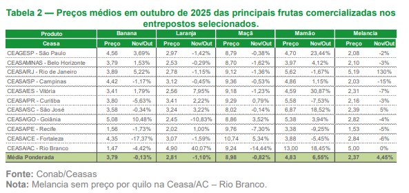 Os preços das frutas comercializadas na Ceasa de Rio Branco apresentaram comportamento variado no mês de outubro de 2025, conforme o Boletim Hortifruti Granjeiro divulgado pela Companhia Nacional de Abastecimento (Conab). Entre os destaques está a banana, que registrou aumento expressivo, acima de 14%, refletindo menor oferta em algumas regiões produtoras e pressão de custos ao longo da cadeia.