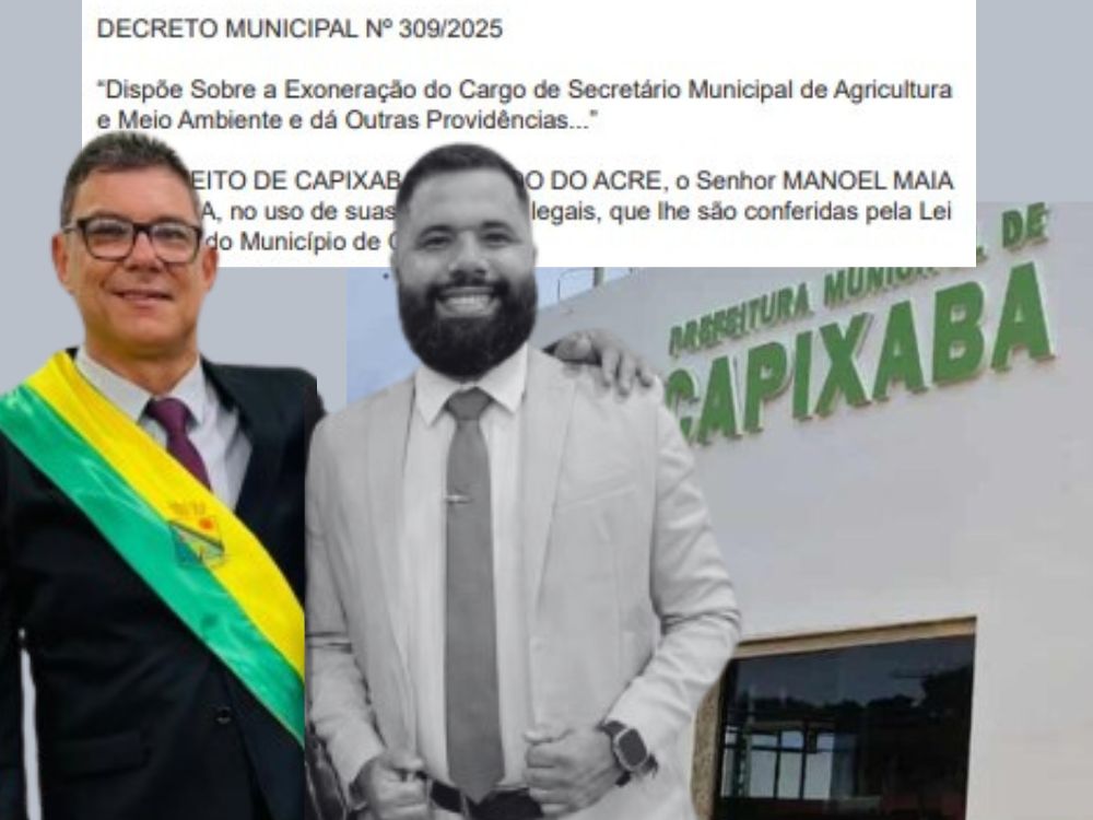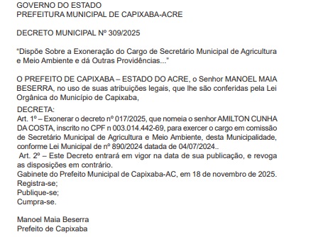 A Prefeitura de Capixaba publicou hoje (21) no Diário Oficial o decreto que exonerou Amilton Cunha da Costa do cargo de secretário municipal de Agricultura e Meio Ambiente. A saída dele que também é vice-prefeito da cidade foi assinada pelo prefeito Manoel Maia e revoga a nomeação feita no início do ano. Procurado pelo Portal Acre Mais, Amilton foi breve, limitado, ao explicar o motivo: “A pedido meu”, respondeu. Contudo, o momento da exoneração chamou atenção.