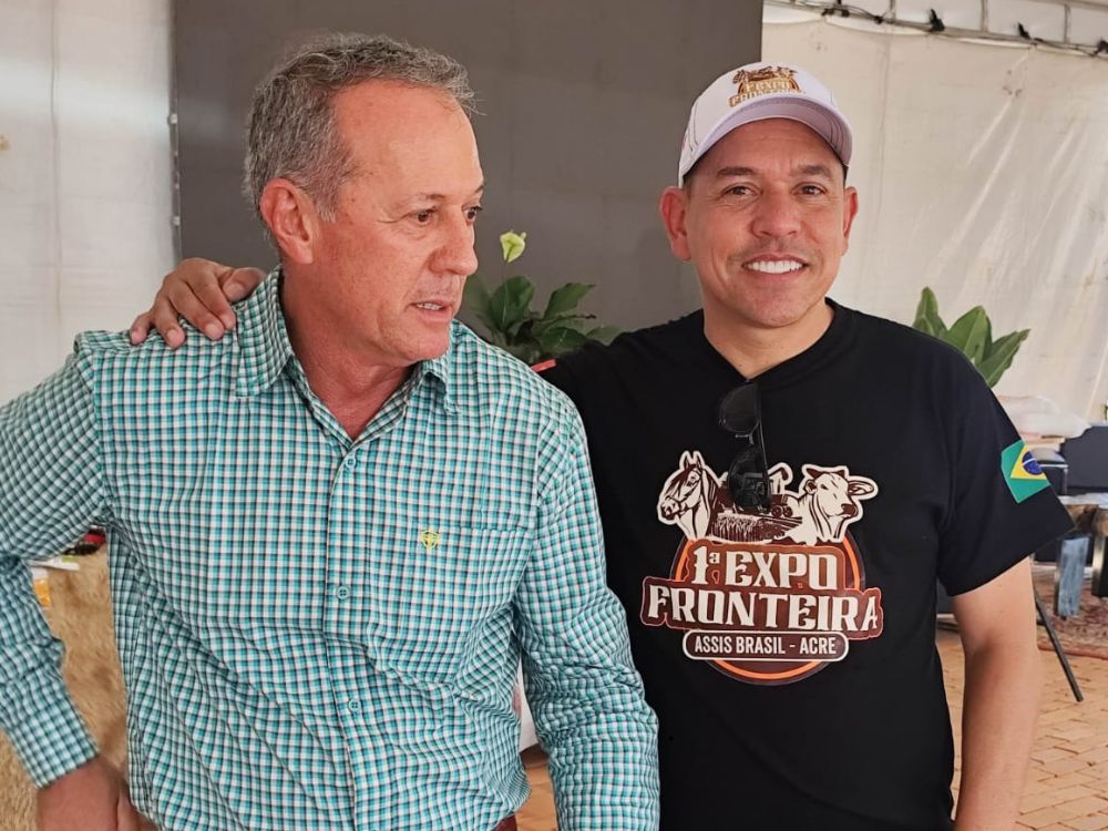 O prefeito de Acrelândia, Olavinho Boiadeiro, esteve na manhã de hoje (04) em Assis Brasil para prestigiar a 1ª Expo Fronteira, organizada pela gestão do prefeito Jerry Correia. Em sua primeira visita ao município, Olavinho elogiou a estrutura da feira e ressaltou a importância da união entre prefeitura e população para o sucesso de eventos desse porte. O prefeito anfitrião destacou a importância da presença do colega no evento: “Uma honra!”.