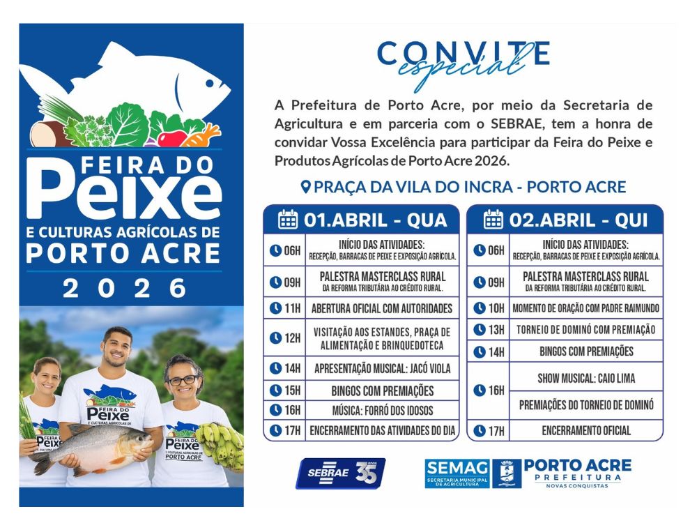 A cidade de Porto Acre realiza nesta quarta-feira (1/04) e quinta-feira (2/04) mais uma edição da tradicional “Feira do Peixe da Semana Santa”, evento que movimenta a economia local e fortalece a produção rural do município. A programação reúne produtores, feirantes e consumidores em um ambiente voltado à comercialização de pescados frescos e produtos regionais, consolidando a iniciativa como uma das principais ações do calendário local. A feira acontece na Praça da Vila do Incra.