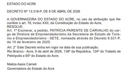 A empresária Patrícia Parente, conhecida por sua atuação à frente do tradicional Café Náuas, foi exonerada do cargo de Diretora de Empreendedorismo da Secretaria de Estado de Turismo e Empreendedorismo (Sete) do Governo do Acre. A decisão foi oficializada por meio de decreto publicado em edição extra do Diário Oficial do Estado (DOE) nesta quarta-feira (8), com assinatura da governadora Maílza Assis.