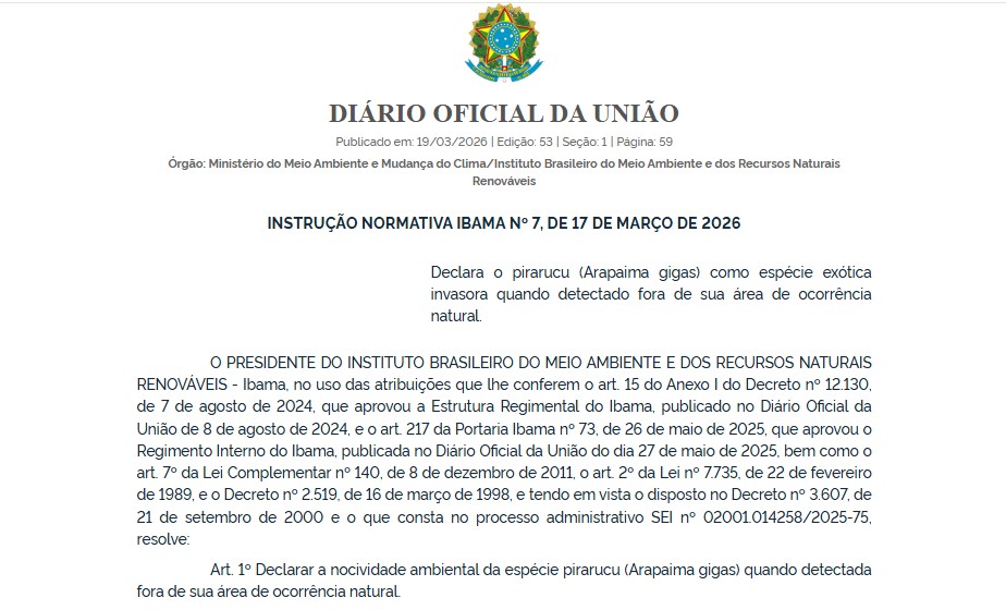 O Instituto Brasileiro do Meio Ambiente e dos Recursos Naturais Renováveis publicou no Diário Oficial da União desta quinta-feira (19) a Instrução Normativa nº 7/2026, que declara o pirarucu como espécie exótica invasora quando identificado fora de sua área natural de ocorrência. Nova norma do Ibama redefine status do pirarucu e amplia controle ambiental em diversas regiões do Brasil.