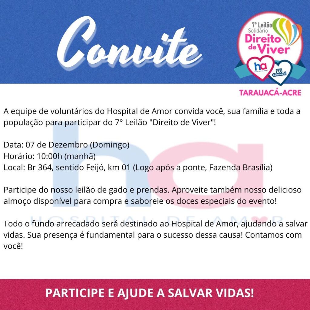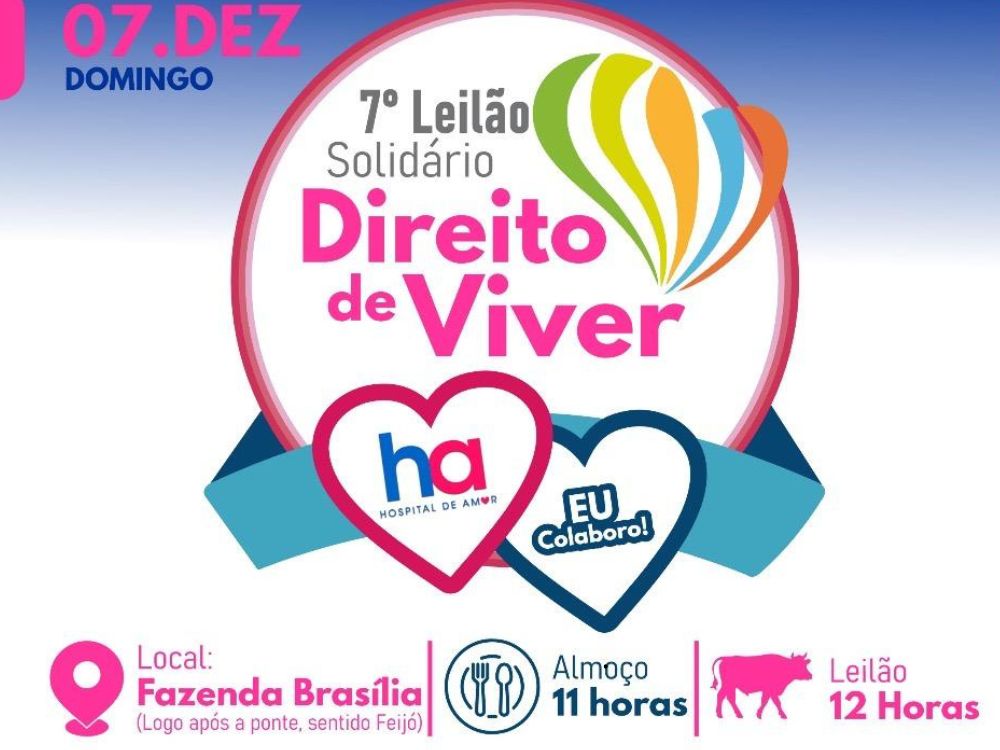 A solidariedade vai tomar conta da zona rural de Tarauacá no próximo dia 7 de dezembro, domingo, durante o 7º Leilão Solidário “Direito de Viver”. O evento, organizado por voluntários do Hospital de Amor, será realizado na Fazenda Brasília, localizada no km 01 da BR-364, sentido Feijó, logo após a ponte. A programação começa a partir das 10h da manhã e promete reunir produtores rurais, famílias e amigos em uma grande corrente do bem.