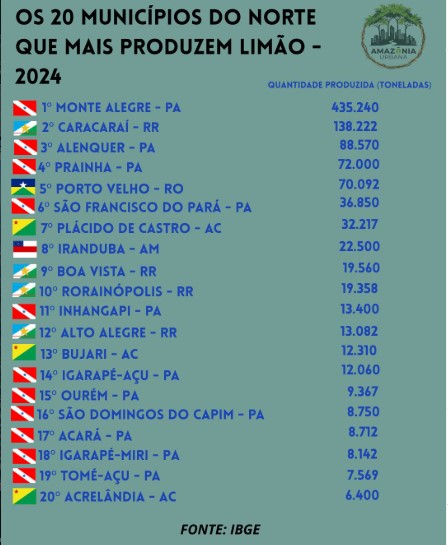 O Acre segue se consolidando como um importante polo na produção de limão no Norte do Brasil, com três municípios figurando entre os 20 maiores produtores da região em 2024, segundo dados do IBGE. Plácido de Castro aparece na 7ª colocação, com uma produção de 32.217 toneladas, seguido por Bujari, em 13º lugar, com 12.310 toneladas, e Acrelândia, na 20ª posição, com 6.400 toneladas. Os números mostram a força da agricultura familiar e do empreendedorismo rural no estado.