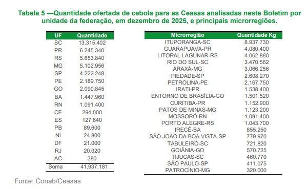 Apesar do cenário geral de valorização, duas centrais registraram queda nos preços em dezembro: Ceasa de São José (SC), com recuo de 14,50%, e Ceasa de Rio Branco (AC), onde a cebola caiu 56,35%. A proximidade das Ceasas catarinenses das áreas produtoras ajudou a conter as altas, enquanto os maiores reajustes foram observados no Nordeste, com destaque para Recife (PE), que teve aumento de 52,82%, e Fortaleza (CE), com avanço de 38,48%.