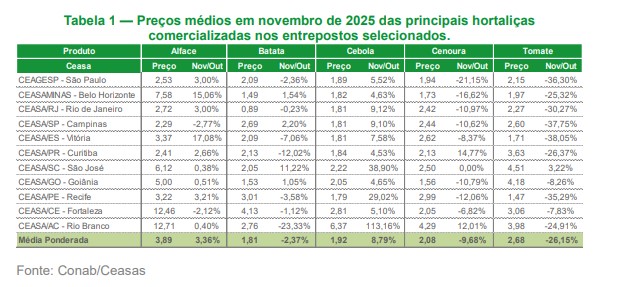 Já para quem trabalha com batata e tomate, o cenário foi o inverso. A batata fechou novembro com média de R$ 2,33, queda de 23,33% frente ao mês anterior. O tomate também recuou e foi vendido a R$ 4,92, o que representa redução de 24,41% no período.