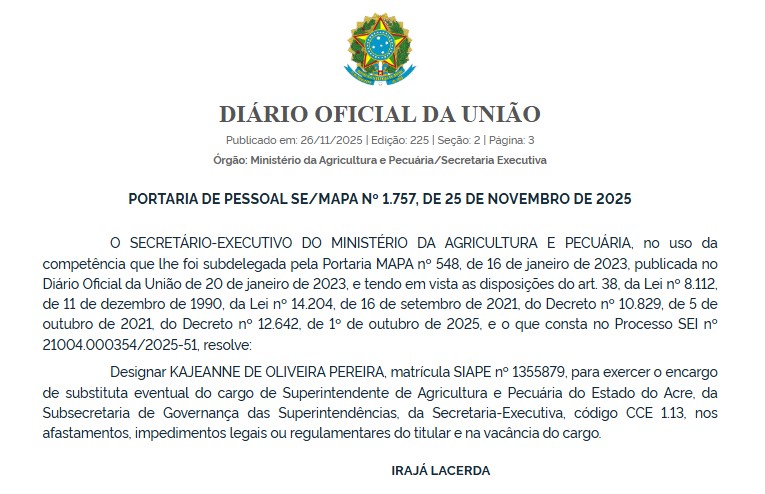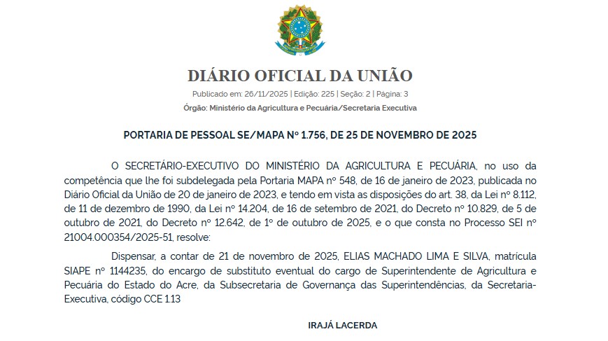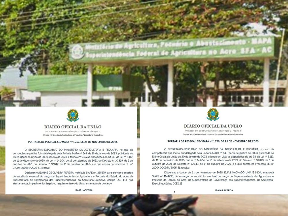 O Ministério da Agricultura e Pecuária (MAPA) oficializou hoje (26) mudanças na substituição da Superintendência Federal de Agricultura e Pecuária no Acre. Publicadas na edição do Diário Oficial da União (DOU), as portarias dispensaram Elias Machado Lima e Silva do encargo de substituto eventual e, na sequência, designaram a servidora Kajeanne de Oliveira Pereira para assumir a função sempre que houver afastamento ou impedimento do titular.
