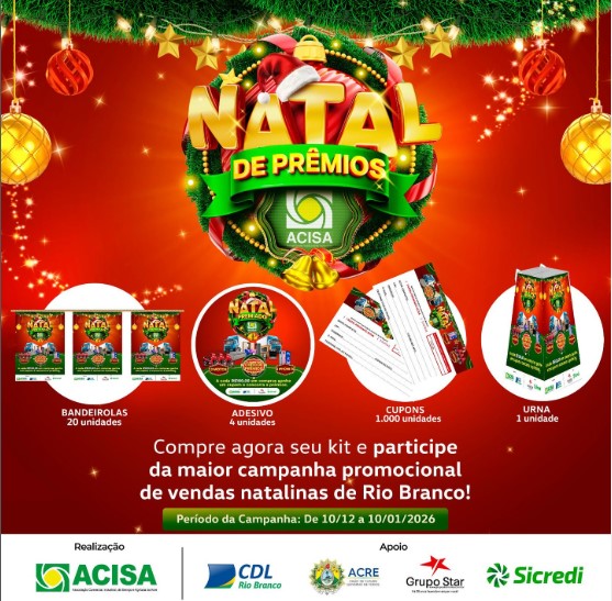 A Associação Comercial, Industrial, de Serviço e Agrícola do Acre (ACISA) deu a largada para uma das ações mais esperadas do fim de ano pelo comércio local: a campanha Natal de Prêmios. A presidente da entidade, Patrícia Dossa, explicou ao Portal Acre Mais que a iniciativa começou nesta semana e segue até 10 de janeiro, movimentando diferentes segmentos da economia acreana, incluindo o agronegócio. A proposta é incentivar as compras de fim de ano e fortalecer a geração de emprego e renda em Rio Branco.