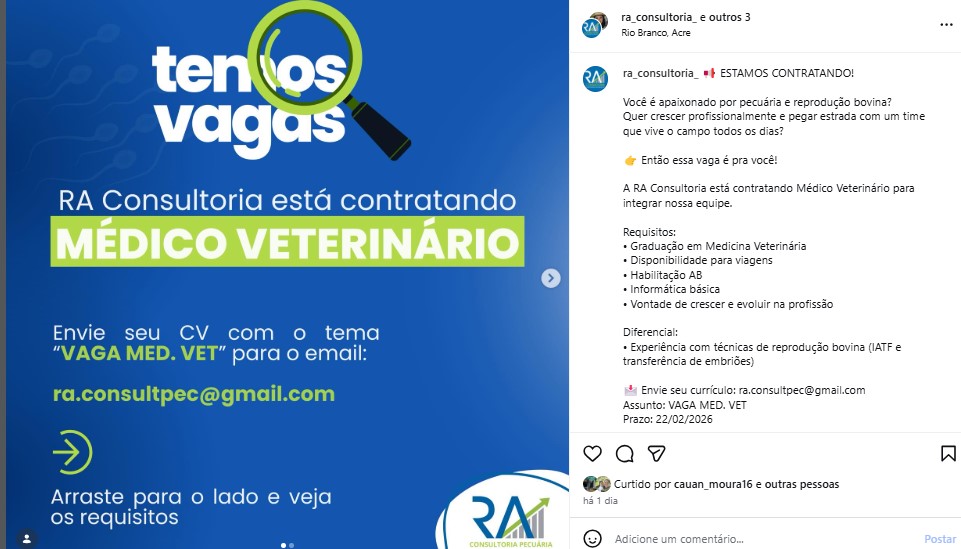 Uma das referências em consultoria da pecuária acreana, a RA Consultoria, anunciou a abertura de vagas para médico veterinário com atuação direta no campo. A oportunidade é voltada a profissionais que desejam crescer na carreira, com disponibilidade para viagens e interesse em trabalhar com sistemas produtivos da pecuária de corte no Acre e em outros estados da região Norte. A empresa é reconhecida pela atuação estratégica em fazendas e pelo foco em resultados técnicos e econômicos.
