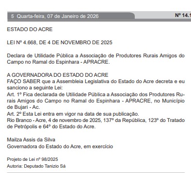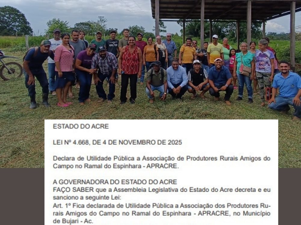 A Associação de Produtores Rurais Amigos do Campo do Ramal do Espinhara (APRACRE), localizada no município de Bujari, acaba de conquistar um passo importante para o fortalecimento da agricultura local. A entidade foi declarada de Utilidade Pública por meio da Lei nº 4.668/2026 publicada no Diário Oficial do Estado (DOE) na quarta-feira (07) reconhecimento que amplia o acesso da associação a políticas públicas e recursos governamentais.