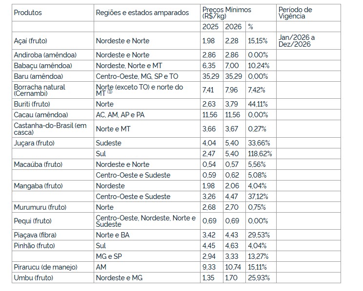 Os novos valores ficam válidos até dezembro de 2026 e foram aprovados pelo Conselho Monetário Nacional. Agora, a expectativa é que associações, cooperativas e compradores locais ajustem suas tabelas e contratos já no início do ano, fortalecendo o escoamento da produção extrativista acreana.