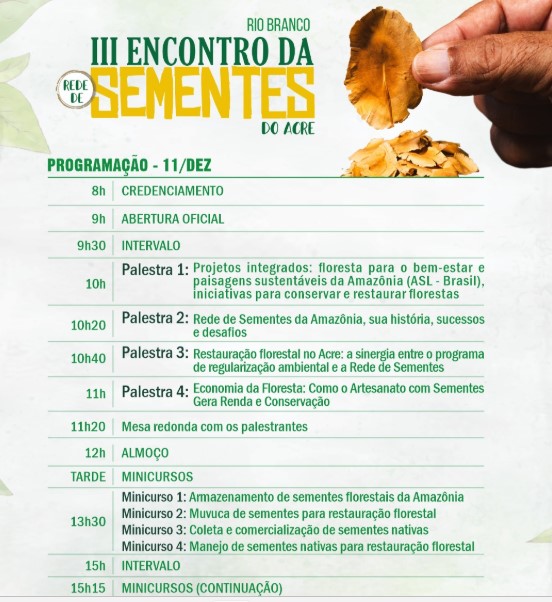 A programação da quinta-feira, dia 11, abre com debates sobre o futuro das florestas acreanas. Entre os destaques, a palestra que apresenta os projetos integrados para conservação e restauração da Amazônia, seguida de uma exposição sobre a história e os desafios da Rede de Sementes. Outro ponto de atenção é a discussão sobre a sinergia entre a regularização ambiental e o uso de sementes nativas na restauração de áreas degradadas. A manhã encerra com uma mesa redonda que reuniu gestores, técnicos e coletores para troca de experiências.