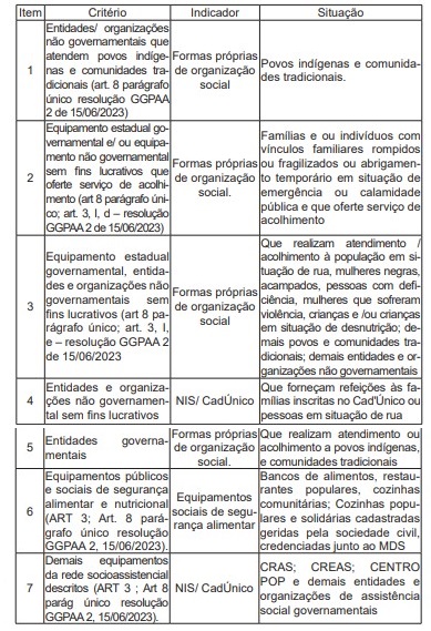 Poderão participar organizações sem fins lucrativos que prestam serviços socioassistenciais, como CRAS, CREAS, Centros POP, cozinhas comunitárias, bancos de alimentos e entidades que ofereçam refeições a pessoas em vulnerabilidade. Para garantir transparência, todas precisam ter CNPJ ativo, registro no Conselho Municipal de Assistência Social e cadastro atualizado no CADSUAS.