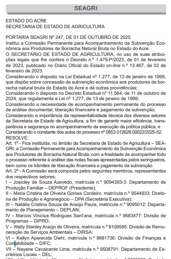 Os seringueiros do Acre podem estar mais perto de receber pagamentos atrasados da subvenção da borracha natural, benefício criado para fortalecer a atividade no estado. Uma portaria assinada pelo secretário de Agricultura, José Luis Schafer, e publicada hoje (02) no DOE, instituiu uma comissão permanente dentro da SEAGRI para acompanhar todo o processo, desde a análise de notas fiscais até a liberação financeira.