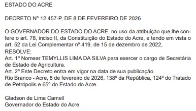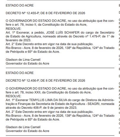 O governador Gladson Cameli (PP) exonerou, por meio de decreto publicado na edição desta segunda-feira (9) do Diário Oficial do Estado (DOE), o secretário José Luís Tchê da Secretaria de Estado de Agricultura (Seagri). Para o lugar dele, foi nomeada Temyllis Silva, que deixa o cargo de diretora de Administração e Finanças da pasta para assumir o comando da secretaria. A mudança marca um novo momento na gestão da política agrícola do Acre e reforça a reestruturação administrativa do governo estadual.