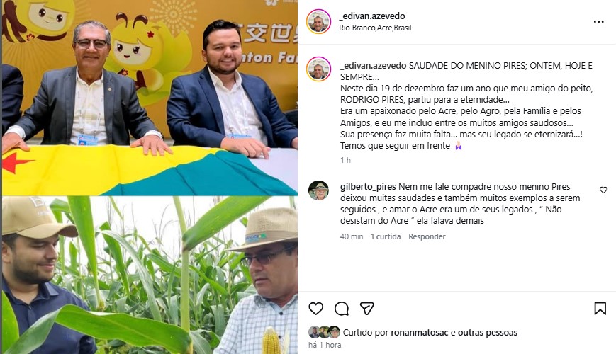 O secretário adjunto da Seagri, Edivan Azevedo, destacou a trajetória de amizade e a paixão de Rodrigo pelo agro e pelo Acre. Em mensagem, ele lembrou que, mesmo com a ausência física, os exemplos deixados seguem vivos entre produtores, empresários e amigos. Para Edivan, a história de Rodrigo é uma referência de compromisso com o setor rural e com as oportunidades geradas no campo.